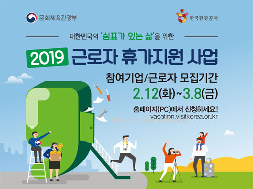 근로자 휴가지원 사업이란 직장내 자유로운 휴가문화 조성과 국내여행 활성화를 위해 지난해 국정과제로 도입됐습니다. 근로자 휴가지원 사업은 근로자가 20만 원을 부담하면 기업 10만 원, 정부 10만 원을 함께 지원해 적립금 40만 원을 휴가시 국내여행 경비로 사용하는 것으로서 3월까지 참여 기업과 근로자 모집 및 적립금 조성을 완료하고, 4월부터 내년 2월까지 사용하는 일정으로 진행됩니다.