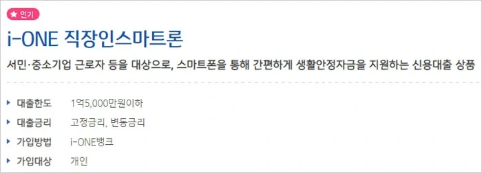 오늘은 기업은행 직장인스마트론 대출 한도, 신청방법 및 대출기간, 금리, 필요서류, 신청대상 자격조건 등에 대해 간단하게 알아보도록 하겠습니다. 기업은행 홈페이지에서 안내하고 있는 기업은행 직장인 스마트론 대출 상품은 영업점을 방문할 필요없이 스마트폰(i-ONE뱅크앱)을 통해 간편하게 지원하는 신용대출 상품이라고 합니다.