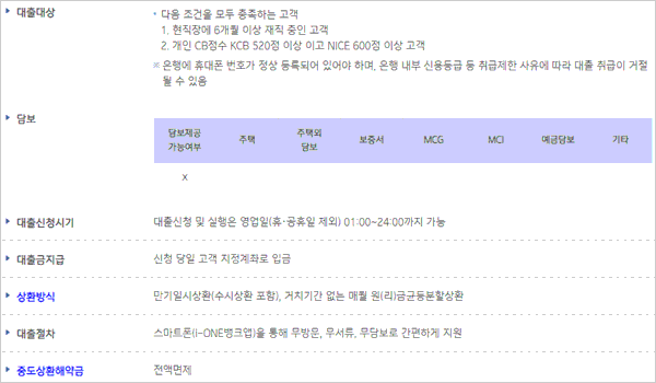 상환방법은 만기일시상환(수시상환 포함), 거치기간 없는 매월 원(리)금균등분할상환 방식이라고 하구요. 담보는 없다고 해요. 금리인하요구권 신청이 가능하며 휴일 대출금 상환이 가능하다고 합니다.