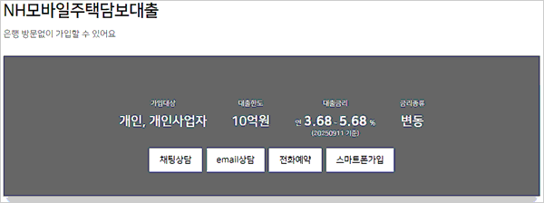 오늘은 농협 주택담보대출 금리비교 조건 및, 상환방법, 한도 금액, 필요서류, 금리, 대출기간, 담보, 중도상환수수료, 대출 유의사항 등에 대해 간단하게 알아보도록 하겠습니다. NH농협은행 홈페이지에서 안내하고 있는 NH모바일주택담보대출은 영업점 방문 없이 농협은행의 모바일 앱을 통해 대출 신청부터 실행까지 모든 과정을 비대면으로 처리할 수 있는 주택담보대출 상품이라고 합니다.