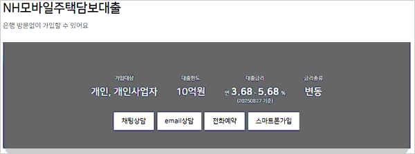 농협의 NH모바일주택담보대출은 스마트폰 앱인 NH스마트뱅킹을 통해 간편하게 이용할 수 있는 비대면 상품인데요. 농협 주택담보대출 상품은 은행에 직접 방문할 필요 없이 모바일로 모든 절차를 진행할 수 있어 바쁜 현대인에게 특히 유용하다고 해요.