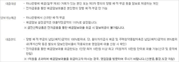 담보가 가능한 예금은 하나은행에서 신규한 예금, 적금, 부금으로서 예금담보 설정금액은 대출약정금액의 110%로 설정된다고 된다고 하는데요. 다만 금전신탁상품은 전자금융을 통한 예금담보대출 취급 시 담보제공이 불가능하다고 해요.