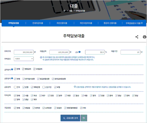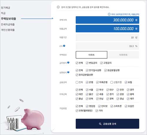 - 대출 종류 (자격): 일반 주택담보대출 외에 보금자리론, 디딤돌 대출 등 정부 지원 정책 상품을 함께 비교할지 여부를 선택합니다. (정책 상품은 금리가 매우 낮으나 소득 및 주택 가격 제한이 있어요.)