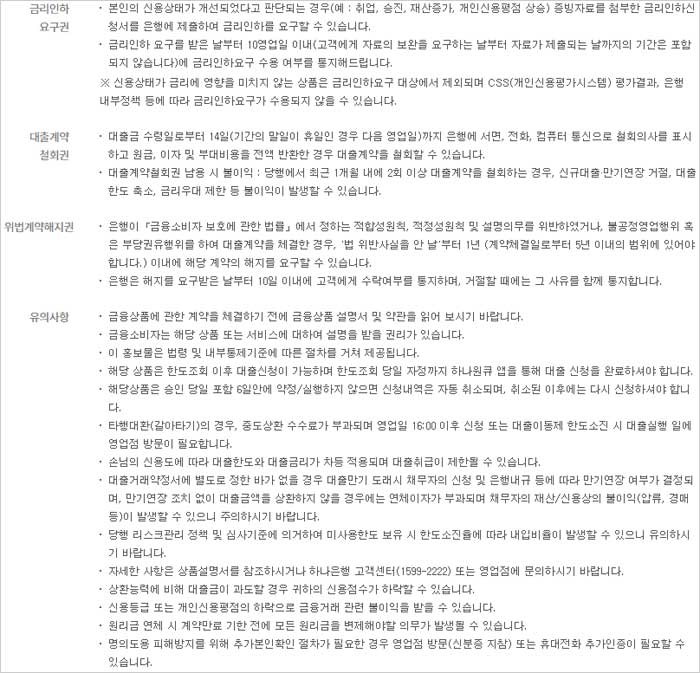 하나은행 직장인 신용대출 조건 중 필요서류 조건 및 한도, 금리, 상환방법, 중도상환수수료, 대출기간, 신청대상 자격 조건 등 보다 자세한 대출 상품에 대한 내용은 상품설명서를 참조하거나, 하나은행 고객센터(1599-2222) 또는 영업점에 문의하면 된다고 하는데요. 참고로 하나은행 직장인 신용 대출 상품은 금리인하 요구권 및 대출계약 철회권, 위법계약 해지권 신청이 가능하다고 합니다. 참고하셨으면 좋겠습니다.