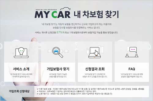 참고로 보험개발원 마이카 내 차보험 찾기는 자동차 보험을 갱신하거나 신규로 가입하고자 하는 이용자와 보험을 인수할 보험회사를 연결해주는 서비스입니다.