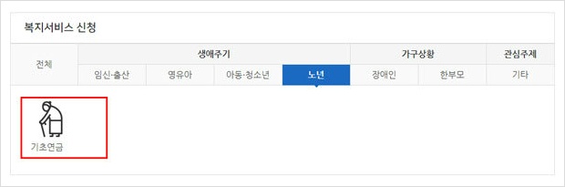 복지로 홈페이지 복지서비스 신청에서 생애주기 노년을 클릭하면