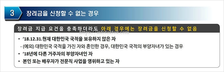 단 가구원과 총소득, 재산 요건이 충족되더라도 배우자를 포함한 거주자가 전문직 사업을 하고 있는 경우와 또는 2018년 중 다른 거주자의 부양자녀이거나 2018년 12월 31일 현재 대한민국 국적을 보유하지 않았다면 장려금 신청자격에서 제외됩니다.단 대한민국 국적을 가진사람과 혼인하거나 대한민국 국적의 부양자녀가 있는 사람은 근로 자녀장려금 신청자격에 포함이 됩니다.