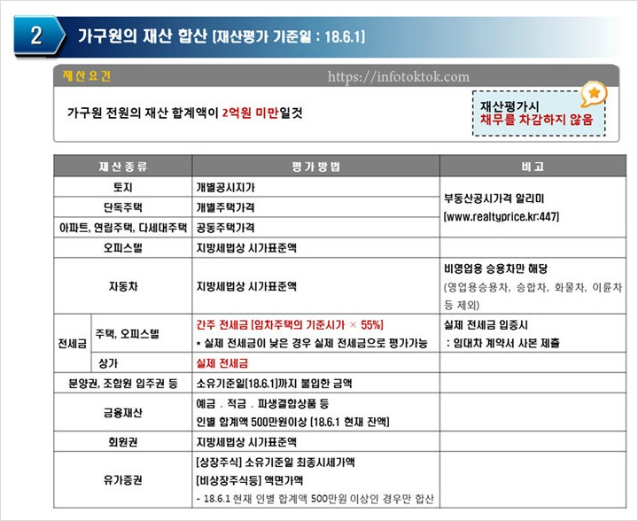 근로 자녀 장려금 신청자격 중 재산 요건을 알아보면 2018년 6월 1일 현재 가구원 모두의 재산을 합산하여 2억원 미만이여야 합니다. 여기서 재산이란 토지 및 건물, 자동차, 예금, 전세보증금 등이 포함되며 부채는 차감하지 않는다고 합니다.