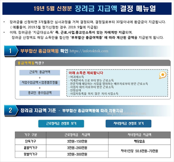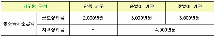 ▶ 또한 부양자녀의 연간 소득금액 합계액이 100만 원 이하여야 근로 및 자녀장려금 신청자격이 됩니다.