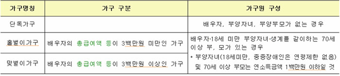배우자나 부양자녀, 부양부모가 없는 단독가구가 해당이 됩니다. 배우자 및 18세 미만 부양자녀 및 생계를 같이하는 70세 이상 부모가 있으면서 배우자의 총급여액 등이 3백만원 미만인 가구가 자격이 되며 또는 18세 미만 부양자녀 및 70세 이상 부모의 연 소득금액이 백만원 이하이면서 배우자의 총급여액 등이 3백만원 이상인 가구 또한 신청자격이 됩니다. 단, 이때 중증장애인 자녀는 연령제한이 없습니다.