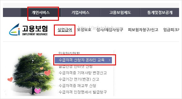 2. 거주지 담당 고용센터를 방문하거나 고용보험 홈페이지에서 수급자격 신청자 교육을 받아야 하는데요. 상단의 개인서비스 클릭 후 실업급여 메뉴에서 수급자격 신청자 교육을 클릭해요. 동영상 시청을 클릭하여 교육을 시청해야 해요.