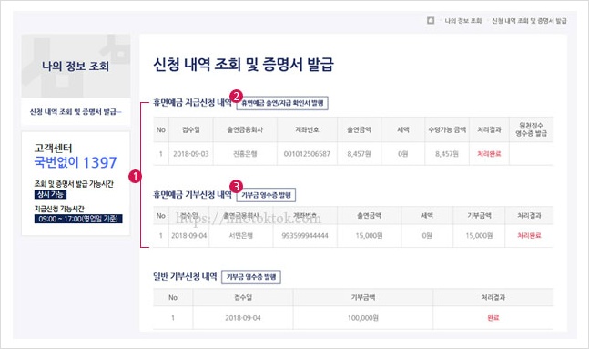 ①에서는 지급 및 기부신청 내역을 확인 할 수 있습니다.