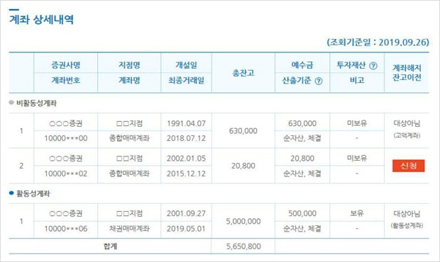 해당 금융회사에 개설된 계좌 상세내역을 확인하구요.