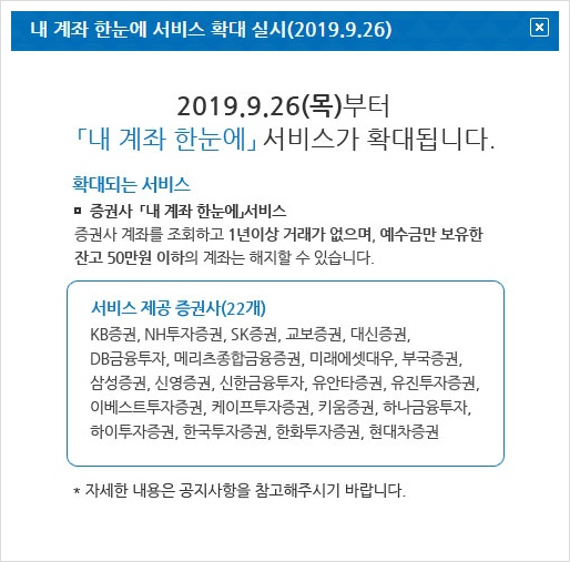 내계좌 한눈에는 본인 명의의 계좌 정보를 일괄조회할 수 있구요. 소액, 비활동성 계좌는 정리할 수 있게 해주는 계좌통합관리서비스라고 해요. 내계좌 한눈에로 조회 가능한 계좌는 22개 증권사를 통해 주식 및 펀드 등을 거래하는 개인 투자자가 개설한 본인 명의의 모든 계좌이구요. 또한 내 계좌 한눈에 서비스를 통하면 50만원 이하 잔액으로 1년 이상 거래가 없는 계좌는 온라인으로 바로 해지 및 이전 할 수 있다고 해요.