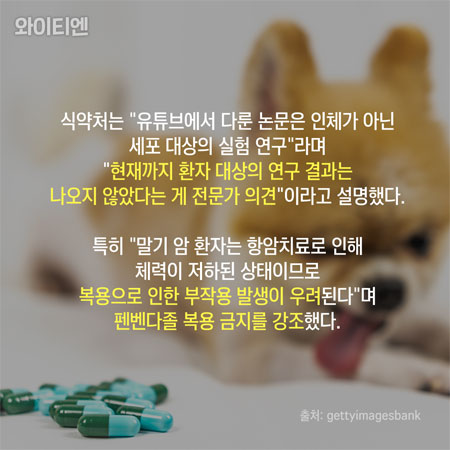 특히 "항암제 같은 의약품은 사람을 대상으로 엄격히 관리되는 임상시험을 통해 안전하고 효과가 있는지 증명해야 식약처에서 허가한다"고 주장했다고 해요. 또한 식약처는 "항암제로 허가받지 않은 펜벤다졸을 암 환자는 절대로 복용해서는 안 된다"고 구입 및 복용 및 펜벤다졸 부작용에 대해 경고했다고 해요.