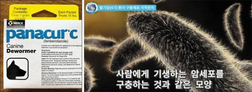 개 구충제 암치료 펜벤다졸 효과 영상이 각종 SNS와 온라인 커뮤니티 등을 통해 확산되면서 동물 구충제를 구입할 수 있는 동물의약품지정병원이나 동물병원에 문의가 폭주하고 있는 실정이구요. 펜벤다졸 구입처 일각에선 품귀현상도 나타나고 있는 것으로 전해졌으며 일부 말기암 환자들은 스스로 임상시험을 자체하면서 복용후기를 올리고 있다고 해요.