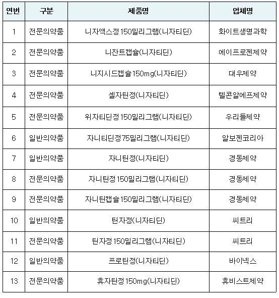 니자티딘 위장약 발암물질 리스트 의약품에 대해 알아보면 화이트생명과학의 '니자액스정(150mg)', 메이프로젠제약의 '니잔트캡슐', 대우제약의 '니지시드캡슐(150mg)', 우리들제약의 '위자티딘정(150mg)', 경동제약의 '자니틴정' 등 10개사의 니자티딘 완제의약품 13개 제품이라고 합니다. 보다 자세한 위장약 발암물질 리스트는 아래와 같습니다.