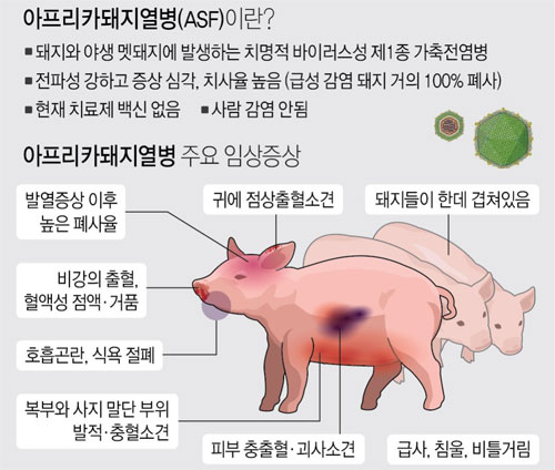 아프리카 돼지 열병은 바이러스성 출혈 돼지 전염병입니다. 돼지과에 속하는 동물에만 감염되죠. 하지만 바이러스에 감염될 경우 치사율이 거의 100%에 이르는 무서운 바이러스입니다. 이 병에 걸린 돼지는 40도에서 42도의 고열이 발생합니다. 식욕부진, 호흡곤란, 구토, 피부 출혈 증상 등을 보이다가 보통 열흘 안에 폐사합니다. 아프리카 돼지 열병 바이러스 잠복기는 나흘에서 최대 19일까지로 알려져 있습니다.