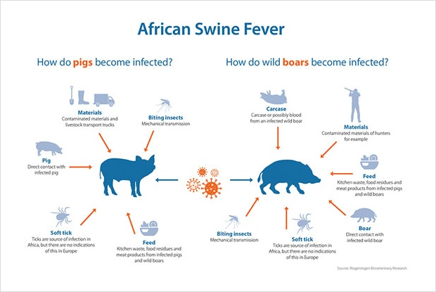 특히 항공기나 선박의 주방 등에서 유래한 음식물 쓰레기를 통해서 전염되기 때문에 국제적으로 오염된 돼지고기를 포함한 음식 찌꺼기를 돼지에게 주는 것이 위험을 높이는 요인으로 지목되고 있습니다. 아직 백신이나 치료 약이 없으며 사람에게는 전염되지 않습니다.