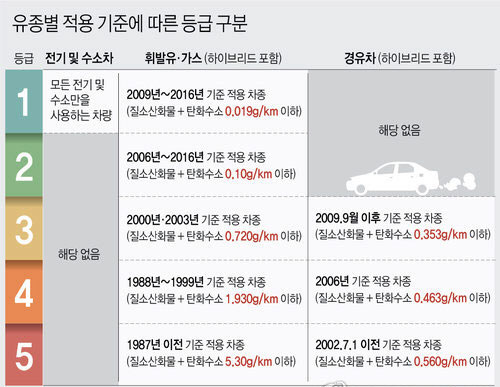 1등급은 전기차·수소차 등 친환경 자동차이거나 2016년 이후 제작된 휘발유·액화석유가스(LPG) 차량이구요. 2등급은 2009년 이후 제작된 휘발유·LPG 차량, 3등급은 대부분 2009년 이후 제작된 경유 차량, 4등급은 대부분 2006년 이후 제작된 경유차로 '유로4' 기준을 적용받은 차량이라고 해요.