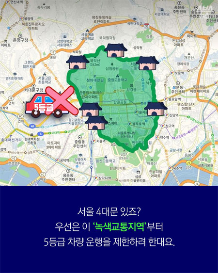 미세먼지 비상저감조치 시행에 따른 5등급 차량 단속과는 별도로 서울시는 사대문 안 '녹색교통지역'에서 배출가스 5등급 차량의 운행을 항상 제한하고 있는데요. 도심에서만 시행중인 녹색교통지역 운행제한의 경우엔 저공해 조치를 신청했거나, 저감장치 미개발 차량에 대해 한시적으로 단속을 유예중이라고 해요. 하지만, 미세먼지가 심한 날 시행하는 비상저감조치 운행제한은 별도의 한시적 단속 유예가 없다고 하네요.