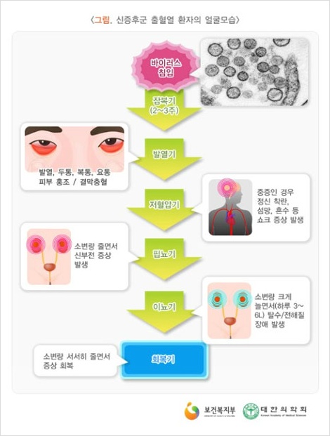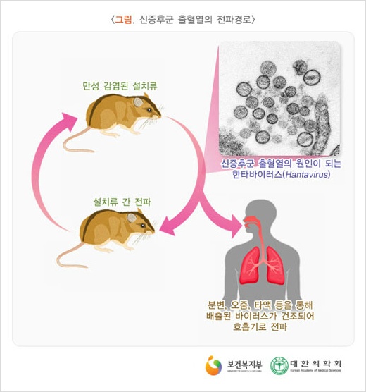 한타바이러스에 의해 발생되는 신증후출혈열 (유행성출혈열)은 호흡기를 통해 전파됩니다. 치사율이 높고 (1~15%) 바이러스는 발병 초기에만 혈액에서 검출됩니다. 유행성출혈열의 잠복 기간은 9~35일 가량 되며, 고열, 구토, 복통이 나타납니다. 임상적 특징에 따라 발열기, 저혈압기, 핍뇨기, 이뇨기, 회복기로 나누어지며 2∼3개월 이내에 모든 기능이 점차 정상으로 회복됩니다.