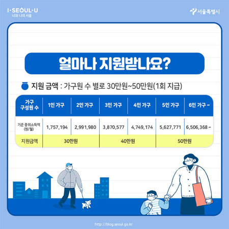 ▶ 서울시 재난긴급생활비 대상은 소득기준 중 중위소득 100%이하 191만 가구 중 정부지원을 받는 73만 가구를 제외한 총 117만7천 가구가 대상이 됩니다. 서울시 재난긴급생활비 신청자격이 되는 가구 구성원 수에 따라 30~50만 원을 지원합니다. 1~2인가구에는 30만 원, 3~4인가구에는 40만 원, 4인가구 이상에는 50만 원이 지원되죠.