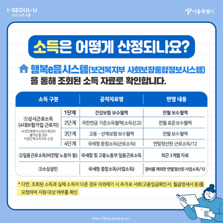 각 동주민센터에서 ‘행복e음시스템(보건복지부 사회보장통합정보시스템)’을 통해 소득조회와 중복지원여부를 가리게 되는데요. 행복e음시스템을 통한 소득조회가 현재 소득을 제대로 반영하지 못하고 있다고 판단될 경우에는 급여명세서 등 소득 확인자료를 제출해야 한다고 해요.