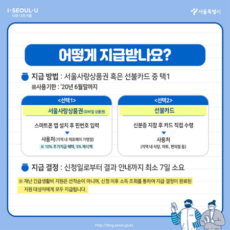 어렵고 힘들지만 늘 행복한 시간 되세요. 지난 30일부터였죠. 서울시가 코로나 사태로 어려움을 겪고 있는 시민들의 생활안정을 지원하기 위해 서울시 재난긴급생활비 신청 접수를 시작했는데요. 오늘은 서울시 재난긴급생활비 신청방법 및 신청자격, 서울시 재난긴급생활비 제외 대상자와 함께 선불카드 사용처에 대해 알아보도록 할께요.