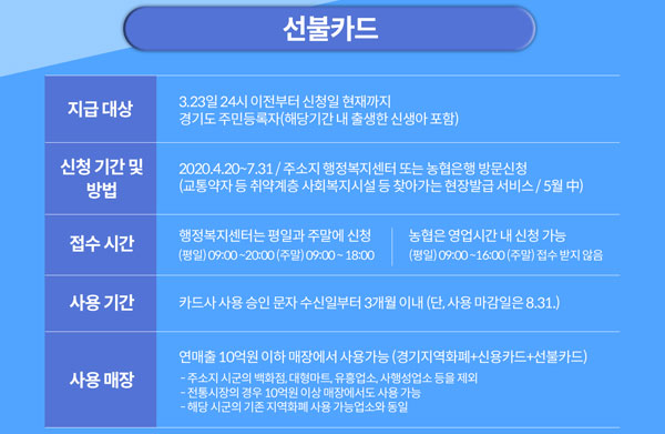 경기도는 읍·면·동 행정복지센터나 농협에 가기 어려운 고령자나 장애인 등 취약계층을 위해 직접 현장에 찾아가 선불카드를 발급해 줄 방침인데요. 도는 5월 중순부터 현장 방문 발급 서비스를 시작할 수 있도록 준비에 들어갔다고 해요.