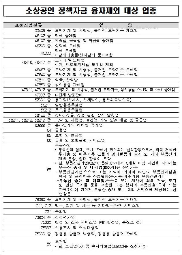 소상공인 정책자금 융자제외 대상 업종은 아래와 같습니다. 참고하셨으면 좋겠어요.