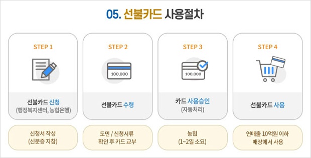 1. 신분증 지참 선불카드 신청. 2. 신청서류 확인 후 카드 교부 3. 카드 사용승인 4. 연매출 10억원 이하 매장에서 사용.