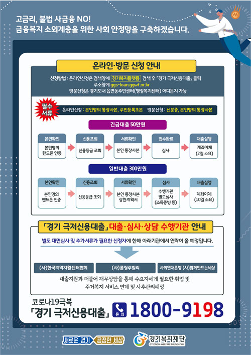 참고로 경기도 극저신용대출은 사회연대은행, 롤링쥬빌리, 한국자활센터협회 등 3곳이 대출 대행을 맡았는데요. 자세한 방법과 문의 사항은 5월 중 2차로 운영되는 '경기 극저신용대출 사업' 전용 콜센터를 이용하면 된다고 해요.