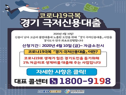 경기도 극저신용 대출 사업은 코로나 사태로 인한 경제위기 극복 대책의 하나인데요. 경기도 극저신용대출은 전국에서 처음 시행되는 극저신용자 대출이라고 해요. 신용등급 7등급 이하로 신용등급이 낮은 경기도민을 대상으로 이뤄진 대출이죠. 지난1차 신청은 마감되었구요. 이에 경기도는 4월 27일부터 2차신청을 받을 예정이였지만 5월로 연기되었다고 해요.