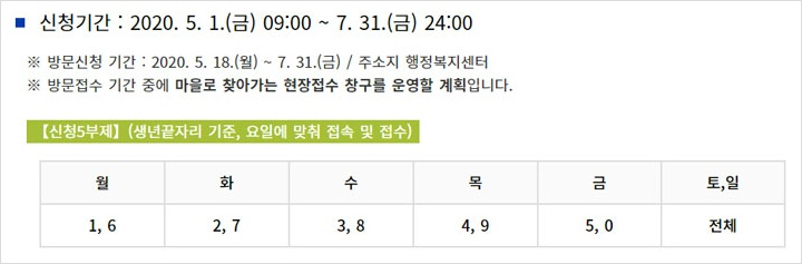 ※ 방문신청 기간 : 2020. 5. 18.(월) ~ 7. 31.(금) / 주소지 행정복지센터