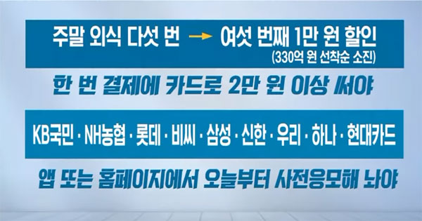 A. 금요일 저녁(오후 4시 이후)부터 외식을 하며 5번을 결제하면 그다음인 6번째 결제 때 정부에서 1만원을 환급해주는 행사임. 만약 같은 식당에서 하루에 외식을 두 번 했다면, 한 번만 한 것으로 인정됨.
