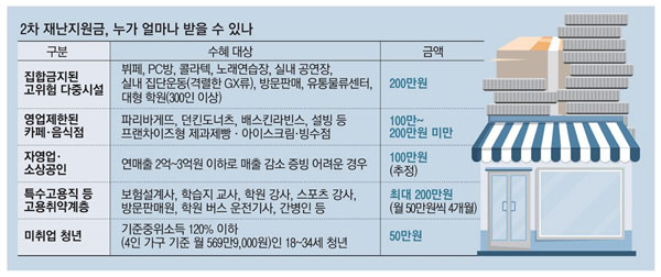 소상공인 및 영세 자영업자에게 '소상공인 새희망자금'이 지급된다. 소상공인 자영업자 긴급 재난금 2차 신청 대상은 총 377만명이다. 이 중 3조2000억원은 현금으로 지급된다. 소상공인 및 2차 자영업자 재난지원금 신청 방침에 따라 약 291만명이 피해 정도에 따라 최대 200만원의 현금 지원을 받게 된다. 소상공인 및 자영업자 긴급재난 지원금 2차 대상 및 지원금액은 다음과 같다.