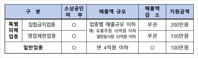특별피해업종이란 8월16일 이후 중앙재난안전대책본부의 사회적거리두기 강화로 집합금지나 영업제한 조치를 받은 업종에 해당하는 소상공인분들이라고 하는데요. 연매출 규모나 매출액 감소와 무관하게 지원받게 된다고 합니다.