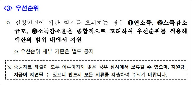 ㅇ 신청인원이 예산 범위를 초과하는 경우 ➊연소득, ➋소득감소 규모, ➌소득감소율을 종합적으로 고려하여 우선순위를 적용해 예산의 범위 내에서 지원