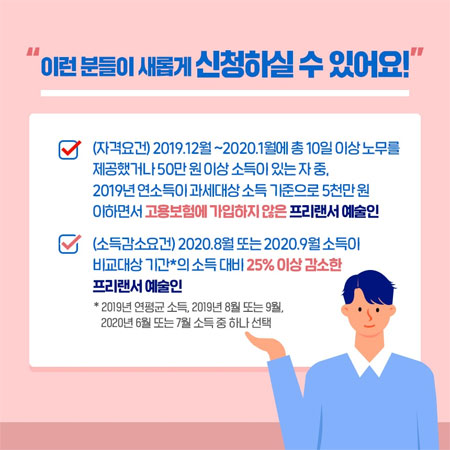 ❖ ①‘19.12~’20.1월에 특고·프리랜서로 활동한 자 중 ②일정 소득 이하(자격요건)이면서 ‘20.8월 또는 ’20.9월의 소득이 과거에 비해 25% 이상 감소(소득감소요건)한 분들이 대상이 된다고 해요.