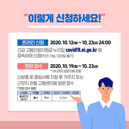 ▶ 신청은 온라인 신청으로 이뤄집니다. 신청기간은 2020년 10월 12일(월) ~ 10월 23일(금) 24:00까지입니다. 2차 긴급고용안정지원금 홈페이지(https://covid19.ei.go.kr)에 접속하여 신청하면 된다고 합니다. (PC만 가능합니다. 모바일은 불가입니다. 참고하시기 바랍니다.)