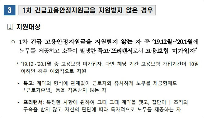2차 긴급고용안정지원금 신청 대상에 대해 알아보면 1차 긴급 고용안정지원금을 지원받지 않는 분 중 ’19.12월~’20.1월에 노무를 제공하고 소득이 발생한 특고 및 프리랜서로서 고용보험 미가입자 분들이 해당된다고 합니다. ’19.12~’20.1월 중 고용보험 미가입자로서 다만 해당 기간 고용보험 가입기간이 10일 이하인 경우 예외적으로 지원된다고 합니다.