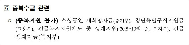 ▶ (중복지원 불가) 소상공인 새희망자금(중기부), 청년특별구직지원금(고용부), 긴급복지지원제도 중 생계지원(‘20.8~10월 중, 복지부), 긴급생계자금(복지부).