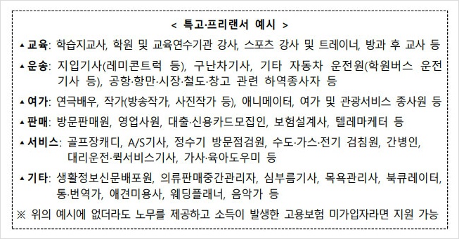 ※ 위의 예시에 없더라도 노무를 제공하고 소득이 발생한 고용보험 미가입자라면 지원 가능합니다.