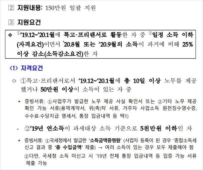 ❖ ①‘19.12~’20.1월에 특고·프리랜서로 활동한 자 중 ②일정 소득 이하(자격요건)이면서 ‘20.8월 또는 ’20.9월의 소득이 과거에 비해 25% 이상 감소(소득감소요건)한 분들이 해당된다고 합니다.