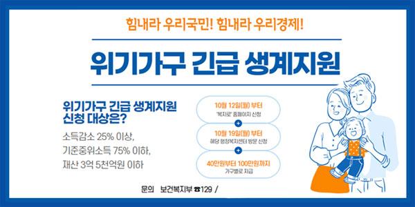 ▶ 지원대상 : 코로나19로 인한 실직 등 가구 소득감소(25% 이상)로 생계가 곤란한 저소득 위기가구.