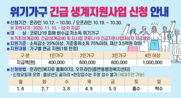 * 타 복지제도(기초생활보장, 국가긴급복지 등) 및 코로나 19 피해 지원사업(긴급고용안정지원금, 소상공인새희망자금, 폐업점포재도전장려금, 청년특별취업지원프로그램 등)으로 기 지원받은 가구 제외.