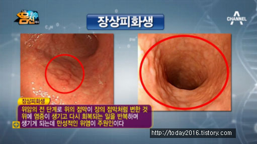 ▶ 장상피화생 : 위세포가 소장 세포로 대치되는 것이다. 이 질환이 있으면 위암의 발생 위험도는 10~20배나 증가한다. 위암으로의 진행률은 0~10% 로 연구마다 차이가 크다고 한다.