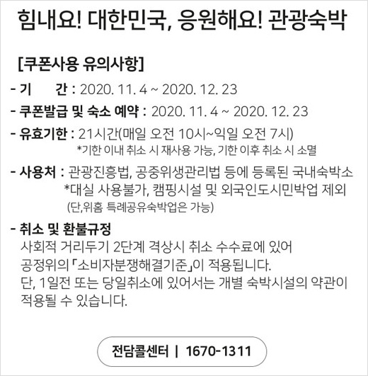 코로나19로 타격을 입은 관광업계를 돕기 위해 시행되는 대한민국 숙박대전과 신규로 도입된 유원시설 소비 할인쿠폰이 11월 4일부터 다시 지급됩니다. 대한민국 숙박대전은 정부와 업계가 총 380억원(정부 280억·업계부담 100억)을 들여 전국에 있는 숙박시설을 이용하면 3만원, 4만원 할인쿠폰을 제공하는 행사라고 합니다.