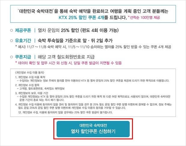 참고로 대한민국 숙박대전 참여 시 별도의 할인혜택도 받을 수 있다고 합니다. 한국철도공사는 대한민국 숙박대전 할인쿠폰 사용자를 대상으로 편도 4회 사용가능한 열차 25% 할인쿠폰을 제공하고 있다고 합니다.
